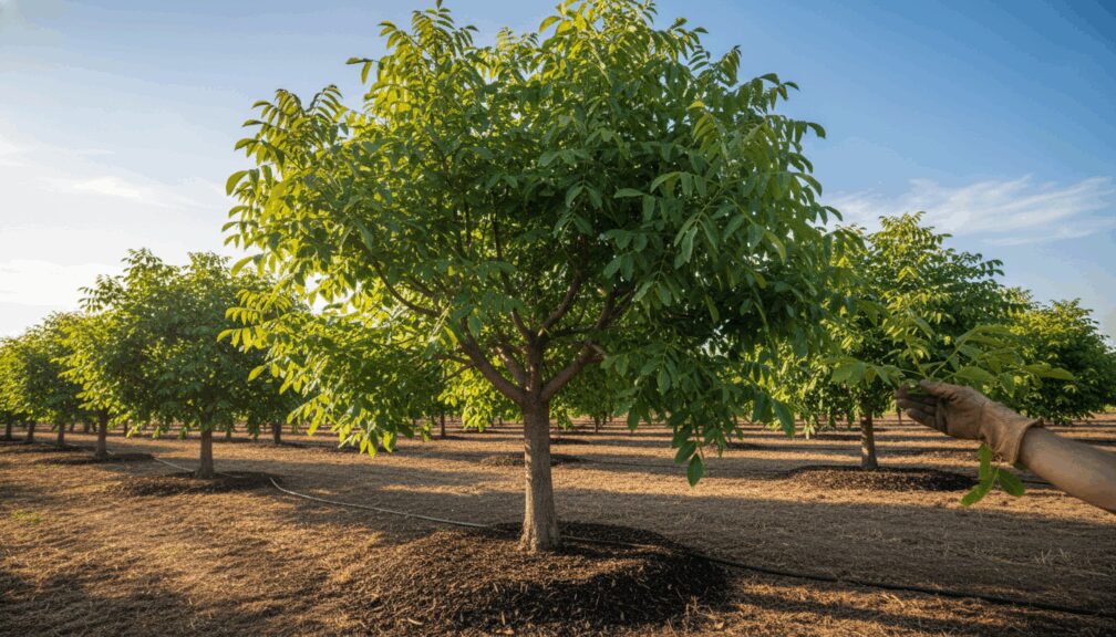 Riega regularmente el nogal durante sus primeros años para favorecer un crecimiento rápido. Sin embargo, evita el riego excesivo, ya que puede provocar la pudrición de las raíces. Cubrir con mantillo la base del árbol puede ayudar a retener la humedad del suelo y mantener una temperatura constante.