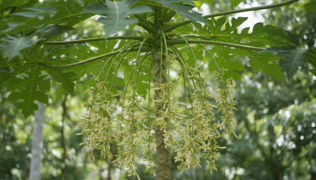 La Carica papaya es una especie de papaya originaria de regiones tropicales y subtropicales. También se conoce como papaya, papayón, fruta bomba, olocotón y papayo, entre otros nombres. Los árboles macho se distinguen fácilmente por los racimos de flores masculinas colgantes, que tienen forma de trompeta y miden entre uno y dos centímetros de longitud. Los árboles macho suelen producir menos frutos o ninguno, por lo que se les denomina «papayo macho».